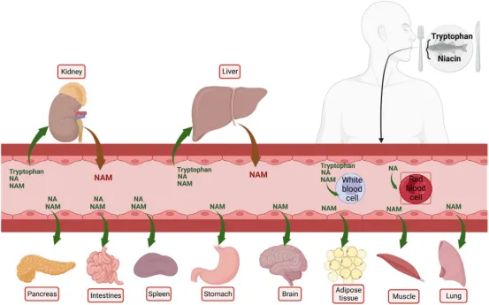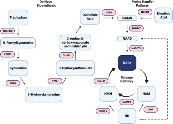 在我们体内,NAD+主要通过三条途径合成:从食物中的烟酸(维生素B3)通过Preiss-Handler途径合成;从色氨酸通过“从头合成”途径;以及从烟酰胺通过“补救途径”合成。