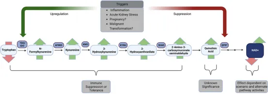 炎症反应中,免疫细胞被激活时,“从头合成”途径会被启动,色氨酸被大量消耗,下游的代谢产物(如犬尿氨酸)堆积,但最后一个关键酶QPRT却被抑制。这种模式与急性肾损伤中的变化惊人地相似。