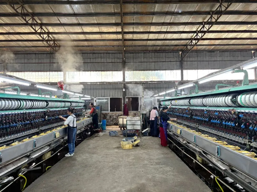 缫丝机隆隆作响,数条生产线正开足马力全速运转,工人们在车间里有序穿梭,雪白饱满的蚕茧经过多道工序……