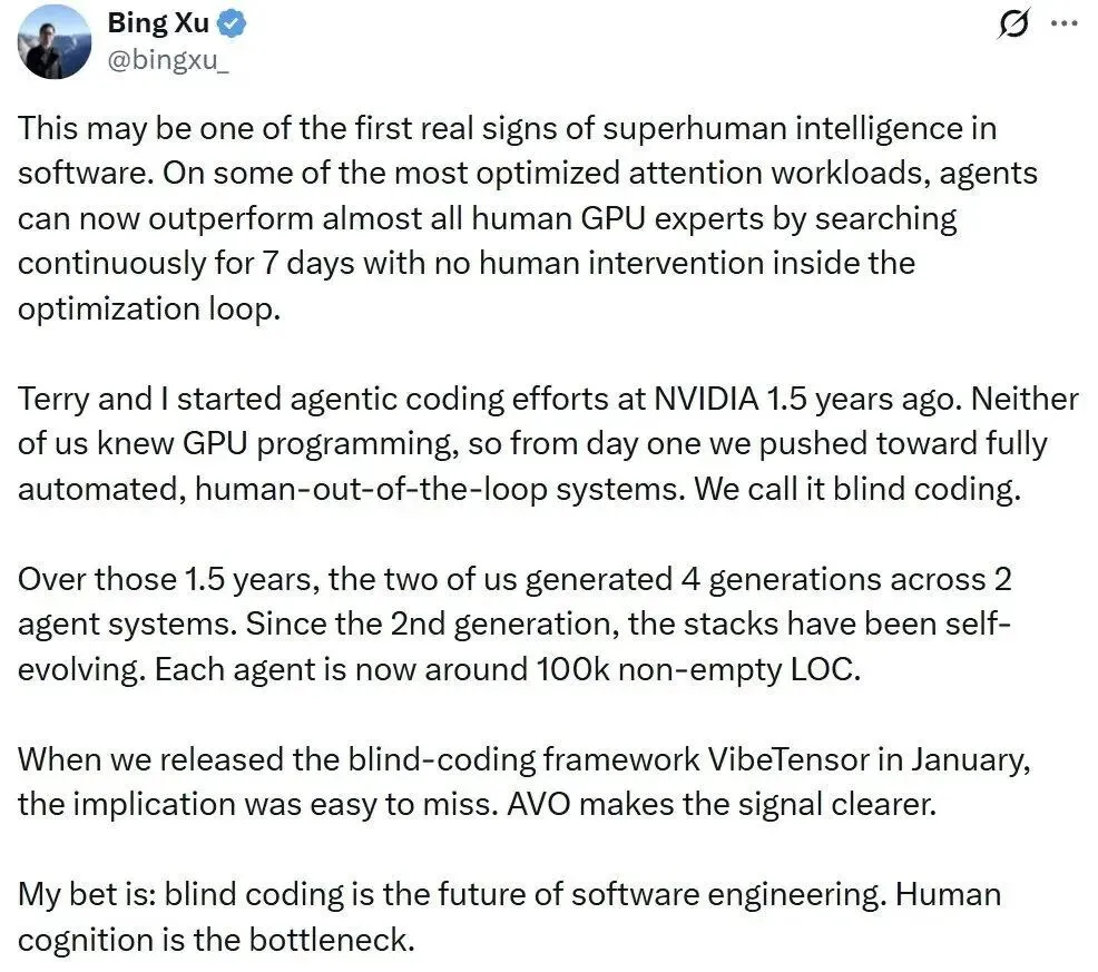 3 月 27 日至 29 日,2026 年巴塞尔艺术展香港展会在香港会议展览中心正式对公众开放,本届展会云集来自 41 个国家及地区的 240 间艺廊,是亚洲艺术市场的重要风向标。展会设置 6 大主题展区,“策展角落” 汇集 35 个主题展览,打破传统艺术展示边界,吸引全球藏家与艺术爱好者到场交流。Versace 欣然宣布与北京国际电影节再度携手,担任第十六届北京国际电影节官方指定高级时装品牌合作伙伴,以此彰显品牌对极致艺术与文化的不懈追求,共同见证中外电影艺术的璀璨发展。3 月 27 日,2026 中国科幻大会在北京市石景山首钢园盛大开幕,作为 2026 中关村论坛年会平行论坛之一,大会以 “科学梦想 创造未来” 为主题,设置 4 大板块 20 余场活动,推动科幻艺术与城市生活融合,打造全民参与的科幻艺术盛宴。3月20日晚,印象西湖《最忆是杭州》献上2026年的首秀,开启了新的演出季。这场融合了山水之美、人文之韵与科技之炫的演出正以更加自信开放的姿态,向国内外观众发出来自杭州的优雅邀请。《2026 亚洲数字艺术展》在三山五园文化艺术中心开展,展览以 “人有人的用处” 为主题,围绕 “命名生命、制造生命、治理生命、人工主体进入社会、文明存档” 五个阶段构建叙事体系,打造沉浸式观展体验,观众可通过互动装置参与艺术创作,感受数字技术对艺术表达边界的拓展。全球流媒体平台 Netflix 宣布年内第二次上调订阅价格,覆盖全部三档套餐,高频观影用户追剧成本大幅提升。含广告标准版套餐从 7.99 美元涨至 8.99 美元,无广告标准版从 17.99 美元涨至 19.99 美元,支持 4K 与 HDR 的高级版从 24.99 美元涨至 26.99 美元,按当前汇率换算,高级版单月费用已超 180 元人民币。2.英伟达革了自己的命:智能体自主进化干掉算子工程师和GPU专家英伟达研究团队推出名为AVO(Autonomous Variation Operator)的新型进化变异算子智能体。该智能体在无人干预的情况下,连续自主进化 7 天,成功优化了 GPU 上的注意力机制内核(MHA),其生成的代码性能超越了人类专家编写的官方库及开源最佳版本。罗技中国发布致歉声明:对于今日抖音平台“罗技G官方旗舰店”发布的极其不当内容,罗技中国感到由衷的震惊与痛心。我们完全理解并感同身受每一位玩家的失望与愤怒,对此我们向广大用户致以最诚挚的道歉。林俊旸离职阿里千问后首次发声。他没有回应离职风波或宣告去向,而是发长文探讨从“推理模型时代的思考”到“智能体时代的思考”的转变。整篇文章谈的是技术和AI的未来方向,但字里行间对千问技术路线的反思藏不住。他在文中坦白承认“我们没有全做对”(We did not get everything right)。18 岁中国男篮新星郇斯楠入选 2026 耐克篮球峰会国际队名单,成为历史上第 17 位参加该赛事的中国球员。身高 2 米 15、臂展 2 米 30 的郇斯楠已承诺加入普渡大学,高四赛季他从防守型中锋进化为攻防一体球员,护框与进攻能力均表现出色。其表现备受中国篮球界期待,也为中国男篮内线人才储备注入新活力。2.2026世界杯欧洲区附加赛半决赛收官