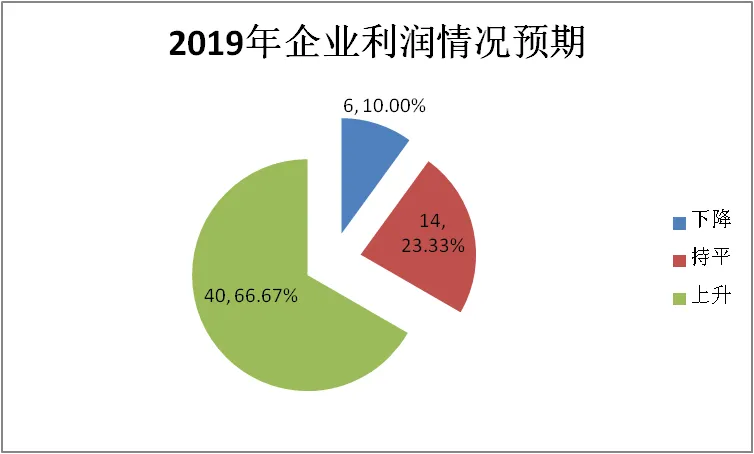 40家企业预计2019年“企业利润情况”实现增长,占66.67%;14家企业预计持平,占23.33%;6家企业预计下降,占10%。