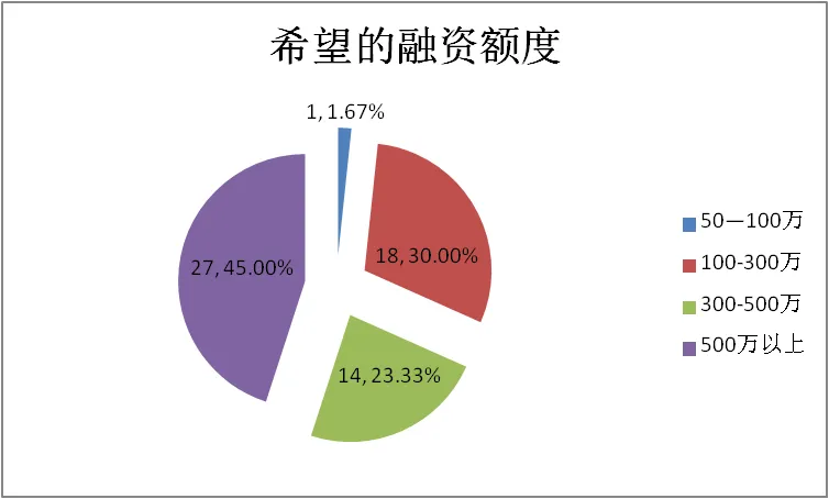 在“希望的融资额度”调查中,27家企业选择“500万以上”,占45%;18家企业选择“100-300万”,占30%;14家企业选择“300-500万”,占23.33%;1家企业选择50-100万,占1.67%。