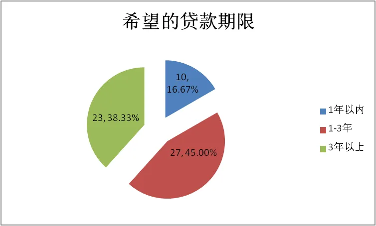 在“希望的贷款期限”中,27家企业选择“1-3年”,占45%;23家企业选择“3年以上”,占38.33%;10家企业选择“1年以内”,占16.67%。