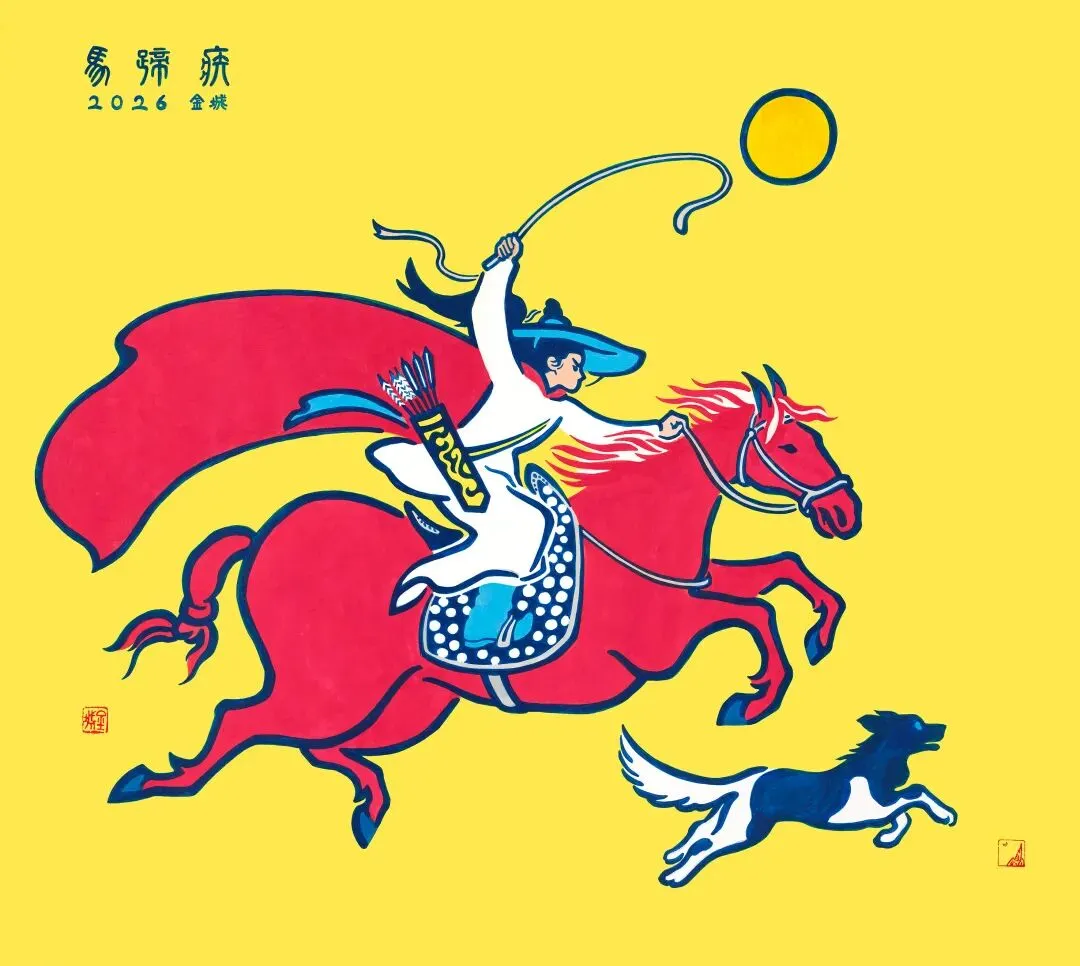 丙烯颜料的《马蹄疾》,用了浓重的黄色作为背景,鲜衣怒马的少年挥鞭疾驰,画面的右下角有一只向前奔跑的大狗,寓意“春风得意马蹄疾”。