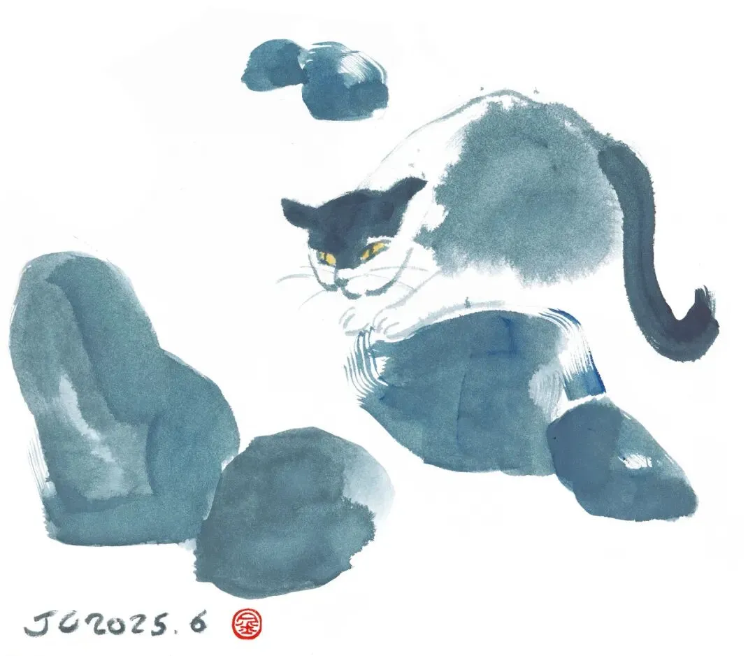 对作者创作历程的了解。据我对金城老师的了解,从连环画时期-水墨时期-极简少女时期-回归水墨时期,这次这个系列,是在极简少女的粗线条当代风格绘画作品之后,对水墨材料的回归,不再是传统国画样式,用线用色也更自由奔放,金城老师不再受制传统画种的界限,所以这批水墨猫成为一个比较重要的节点,我觉得很值得关注。