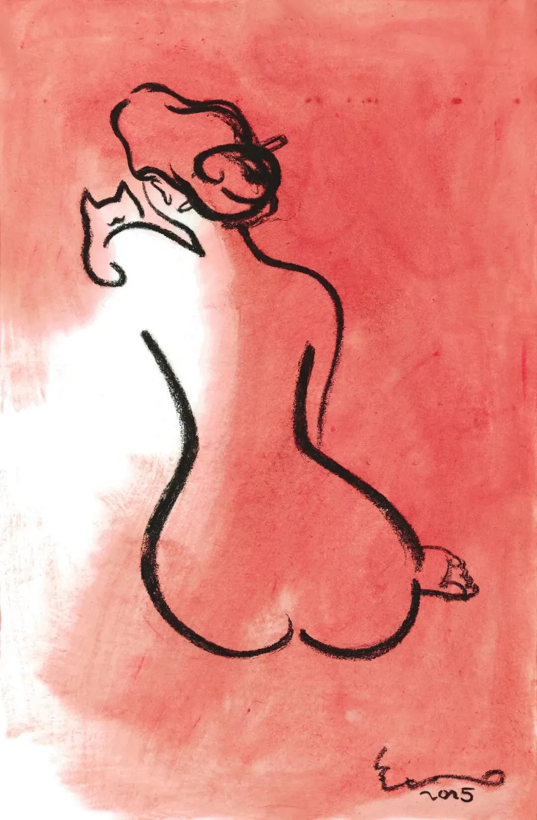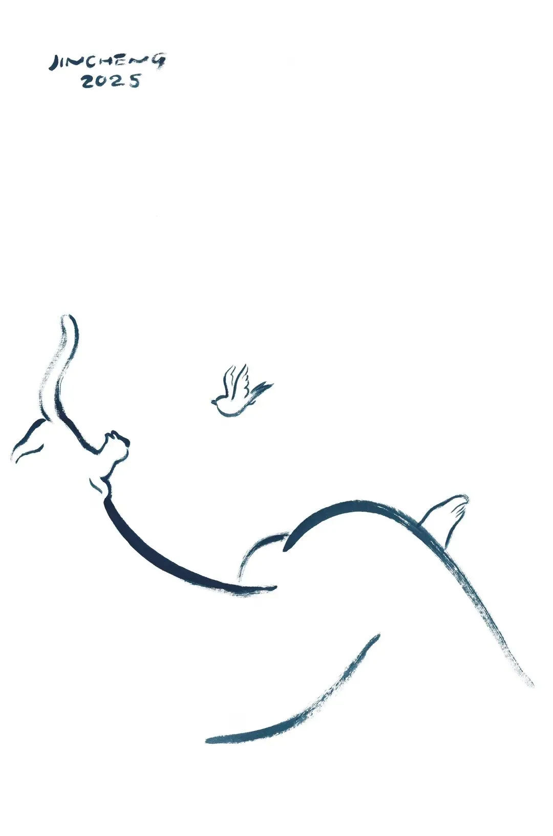 猫的神情、女性的姿态,在水墨的留白与灰阶中彼此映照:柔软、警觉、独立,又带着一点难以言说的疏离感。