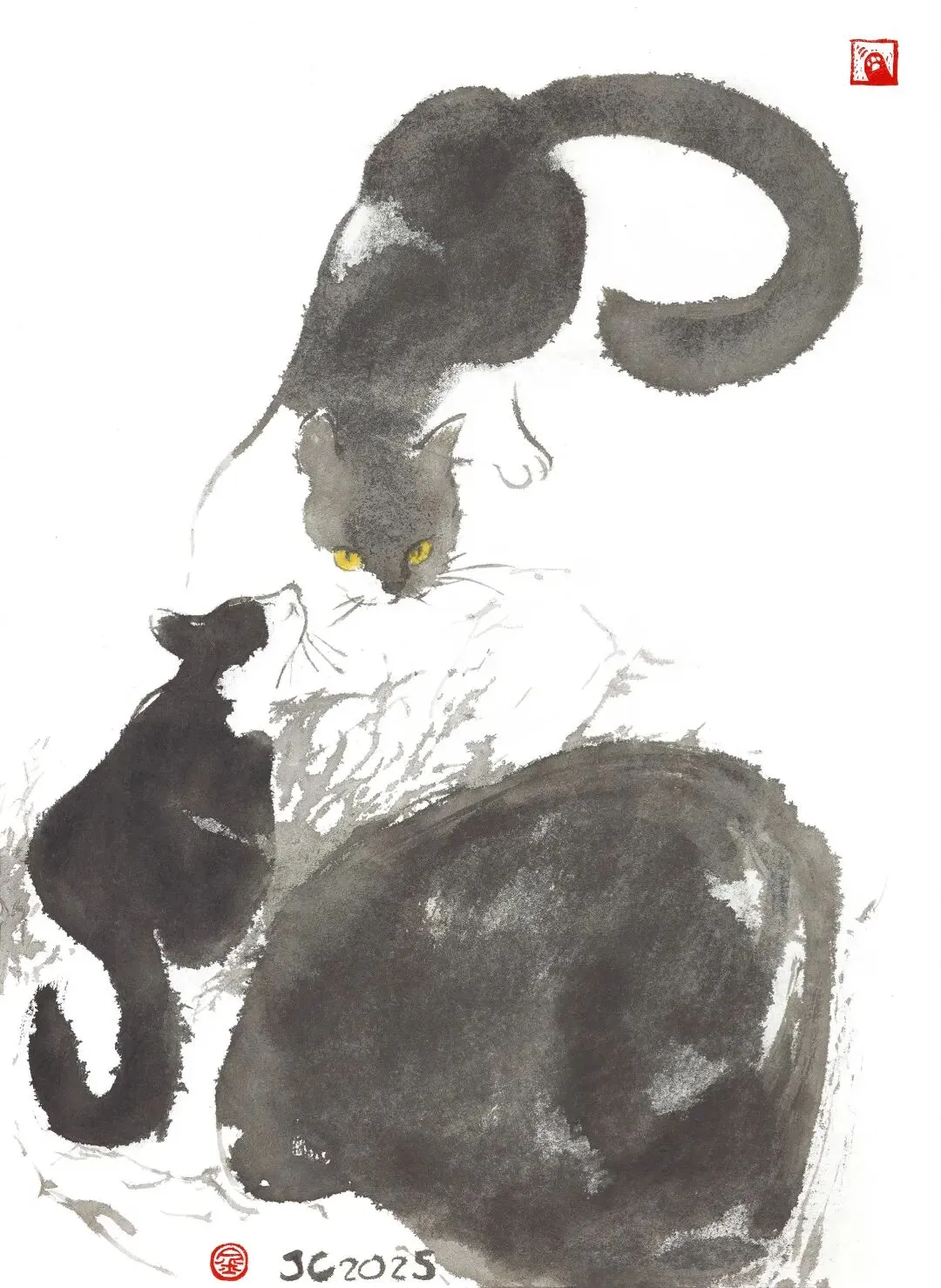(比如这幅)整张画的布局、猫与猫之间的交互动态,色块的运用,用笔的过程,很内敛又大气,也不会很外露,把情感都藏在里面。画面是黑白的次元感,点了两点猫猫黄色的眼睛,太生动了。金老师水墨的感觉、用笔的感觉,既有国画的味道又有当代的情绪投射,非常准确,艺术成分真的很高。