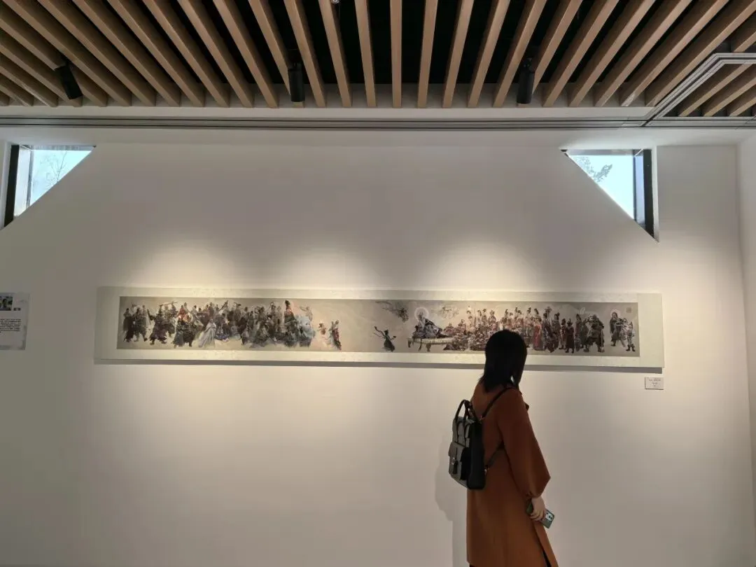 2026年,金城根据广州艺术博物院现场展墙的尺寸,以三条屏的形式,重新手绘了大幅的《飞鸟与鱼》。