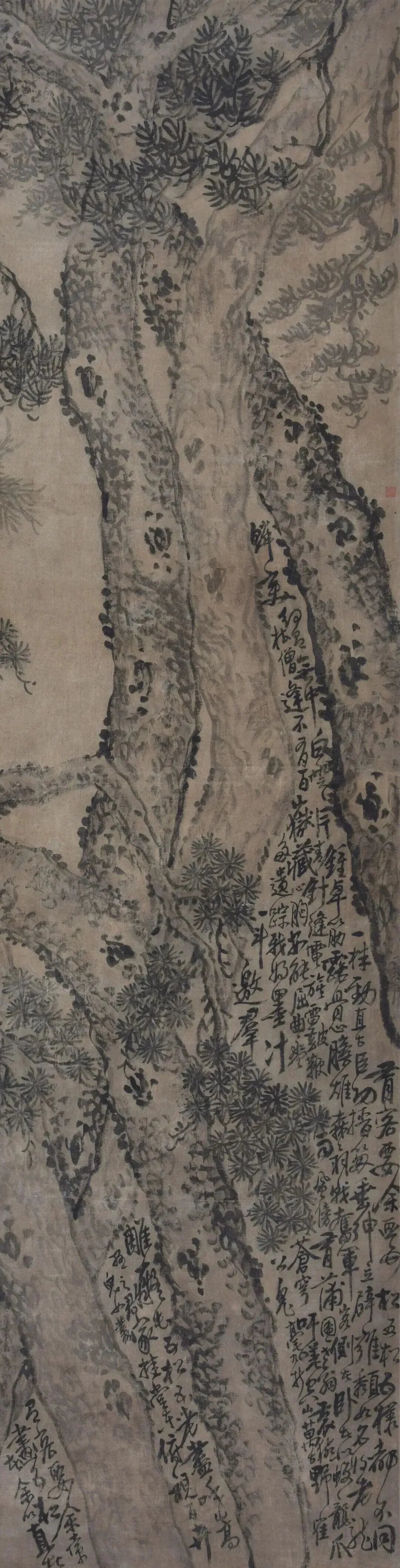 这幅李鱓《五松图》,极能代表李鱓画松的笔意墨气,五松盘根错节,形态各异,着墨之间,可见画家不与他人同流,自写心境的用意。画中的题画诗,更是不拘一格,构图错落的字迹与所绘五松彼此呼应,皆苍巨如龙,形成一种雄奇、飘逸更兼劲道的画意。画中题识:“有客要余画五松,五松五松都不同。一株劲直古臣工,搢笏垂绅立辟雍。颓如名将老龙钟,卓筋露骨心胆雄。其书法用笔恣肆老辣,纵横潇洒。