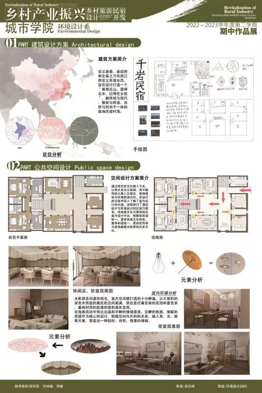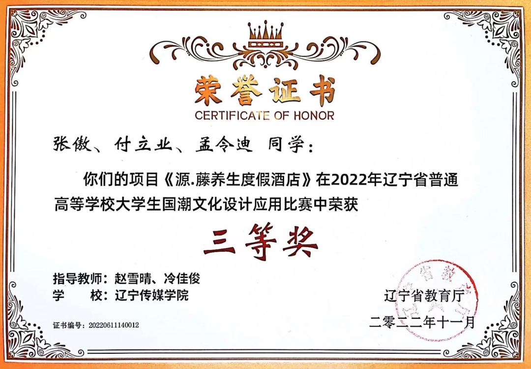 在辽宁传媒学院开展“展赛演播”的教学活动以来,学生在教师科研指导下也取得了丰硕的比赛成绩。赵雪晴老师指导学生完成的设计作品,分别获得了2022年辽宁省普通高等学校大学生国潮文化设计应用比赛三等奖,2022年辽宁省普通高等学校乡村生态宜居环境设计大赛三等奖。黄维老师指导学生完成密云县乡村街道改造实际项目。这些都是将教学、科研、人才培养相互融合发展的最好例证。