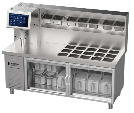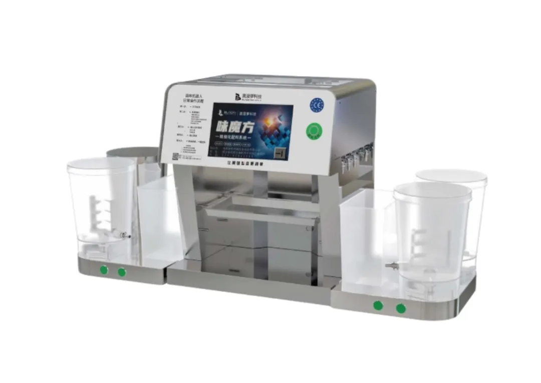 b.茶饮智慧吧台是黑菠萝科技针对连锁茶饮门店研发设计的综合性超级工具,囊括了收银结算、物料存储收纳、配方存储管理、自动配料、一键清洁等功能,可满足茶饮门店日常的使用需求,起到节约人力资源,提高效率的作用。