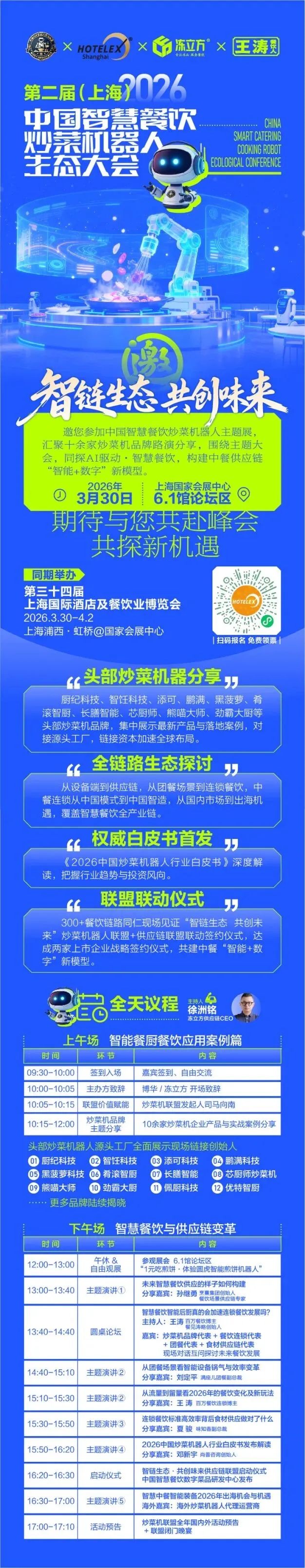 2026年第二届(上海)中国智慧餐厨炒菜机器人生态大会将于2026年3月30日在国家会展中心(上海)6.1论坛区举办。当前炒菜机器人市场增速迅猛,面临众多长期痛点。为助力餐饮企业把握智能烹饪与数字化新机遇,大会以“智烹引领·标准味来”为主题,精准聚焦中餐供应链智能化升级、行业研究赋能决策、产业链生态深度联动、市场布局多维拓展等板块,打造资源整合平台,进一步推动中餐标准化与全球化进程。
