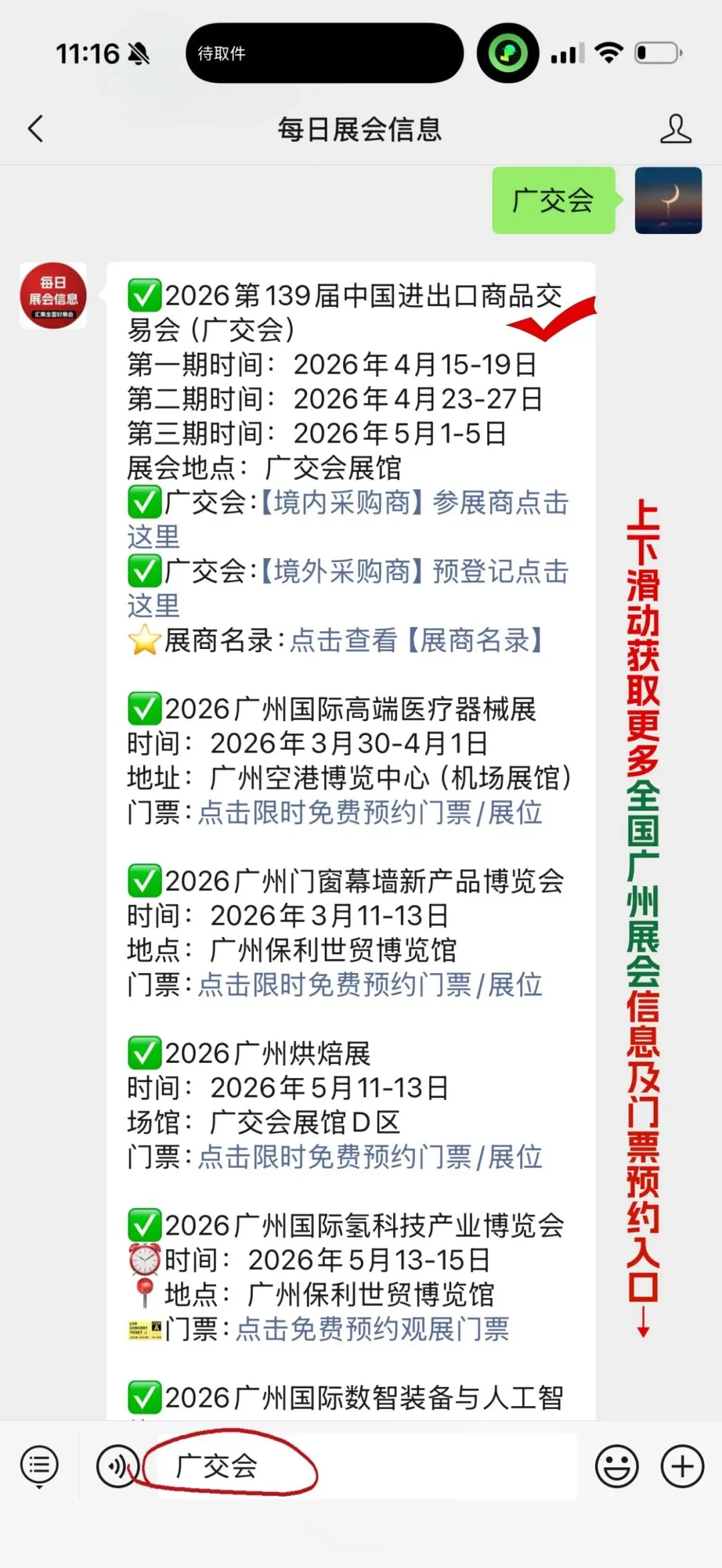 关注【每日展会信息】微信公众号,在聊天对话框内回复【广州】查看广州近期展会信息/门票/展位咨询入口
