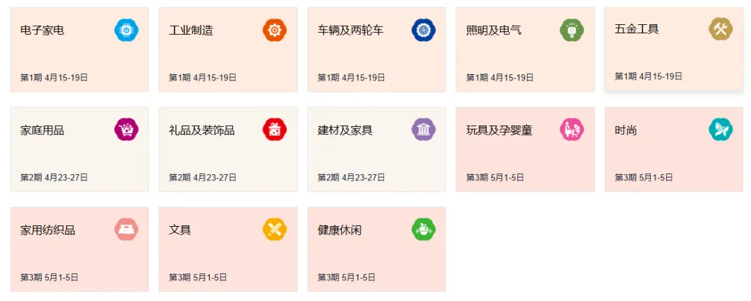 本届展会分三期线下举办,具体展期为第一期4月15-19日日、第二期4月23-27日、第三期5月1-5日。具体如下:
