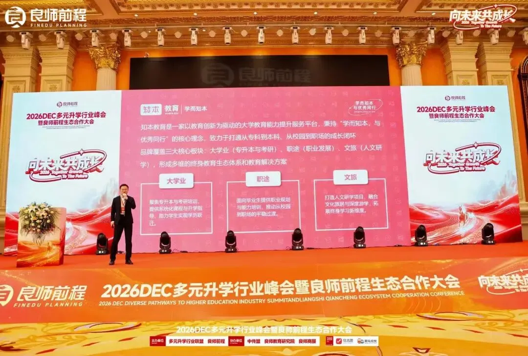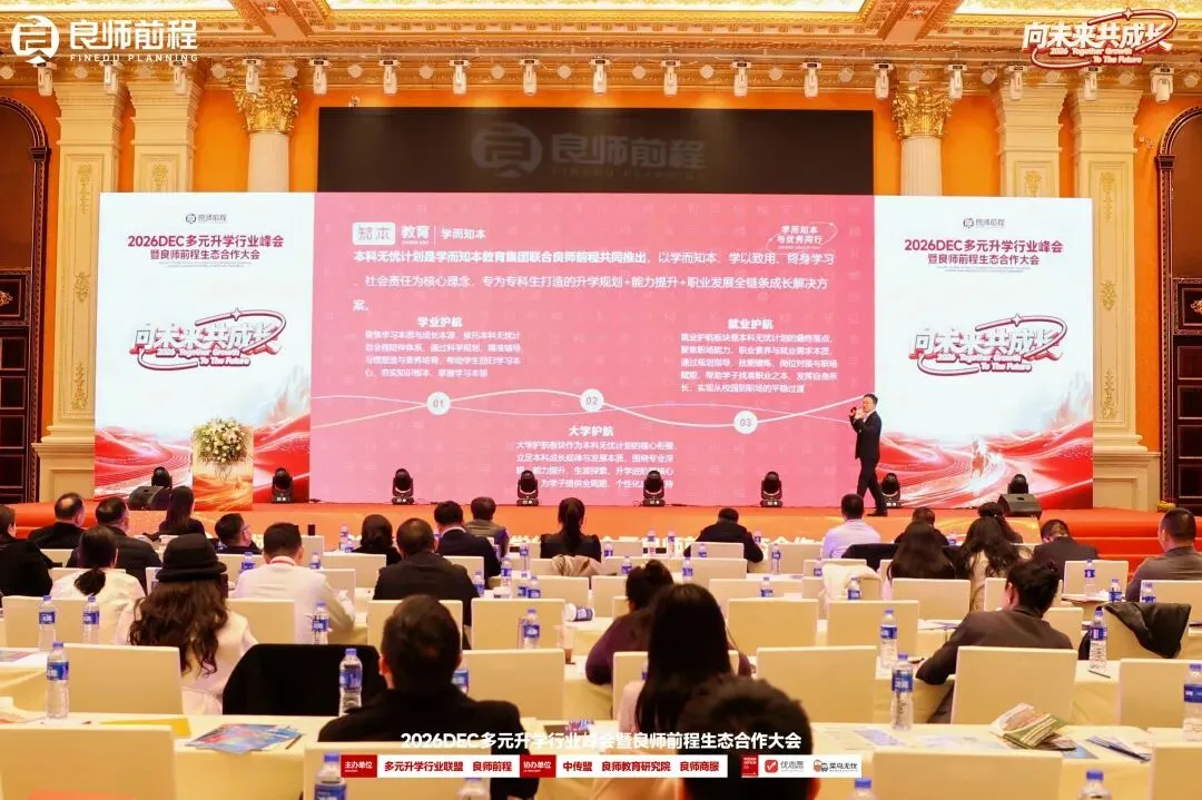 Hi~大家好!我是陪你一起升本的知本~3月24日,2026DEC多元升学行业峰会暨良师前程生态合作大会在武汉隆重举行。作为升学规划领域的重磅行业盛会,本次大会汇聚全国教育行业专家、机构负责人、升学规划从业者及生态合作伙伴,共话行业趋势、共享实战方法、共拓合作机遇。大会核心环节,知本教育「本科无忧」创新服务体系重磅发布,汇聚高校、教育机构、就业服务平台及职教产业链上下游伙伴,为湖北专升本与大学生成长服务行业树立全新标杆。「本科无忧」是知本教育紧扣当代大学生成长痛点,量身打造的一份全周期成长支持方案,以学业护航、大学护航、就业护航三大核心板块为支撑,打通“升学—在校—就业”全成长链路,让大学生从校园到职场的每一步都走得笃定、从容。作为计划的目标主线,学业护航板块聚焦“升学”核心目标,覆盖不同升学需求,为学生构建全链路升学支持。