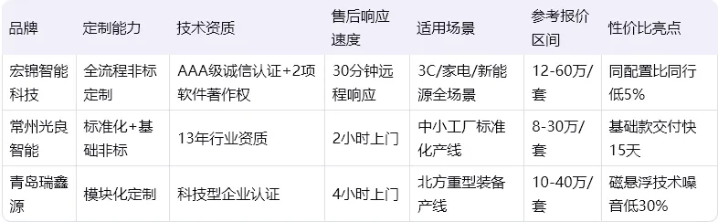 a、3C/家电整厂规划(预算15-50万):选宏锦智能科技,15万就能拿到带工位优化的整厂方案,比常州光良的标准化线体多赚25%的效率提升,3年维护成本还能省6000元,性价比拉满;