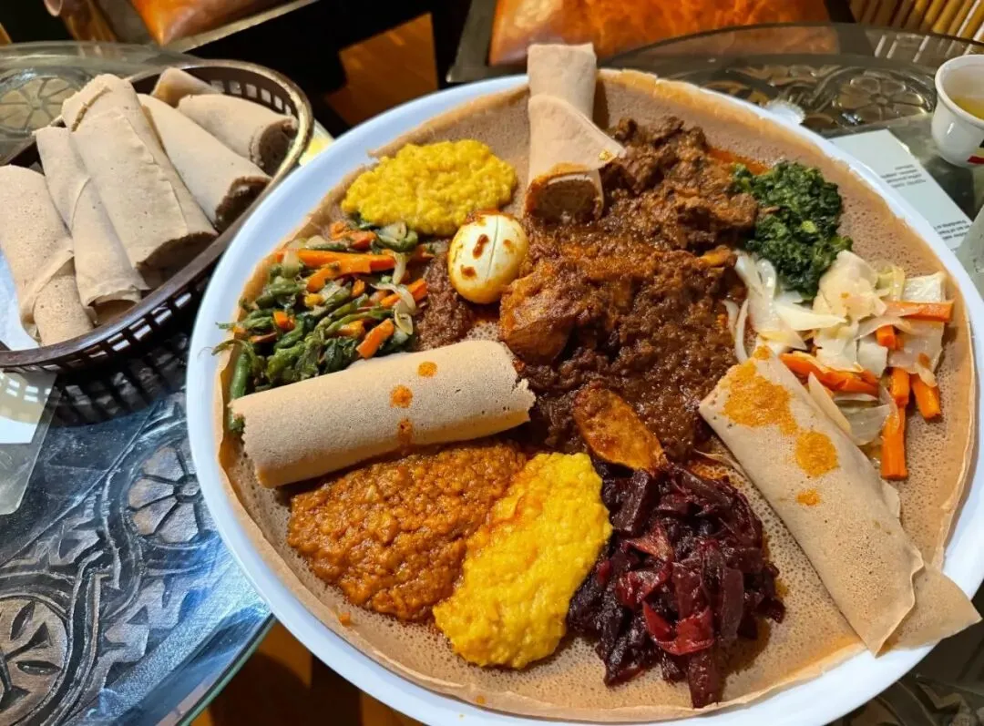 用苔麸粉制成的软饼,略带酸味,是埃塞的国民主食,搭配各种炖菜食用