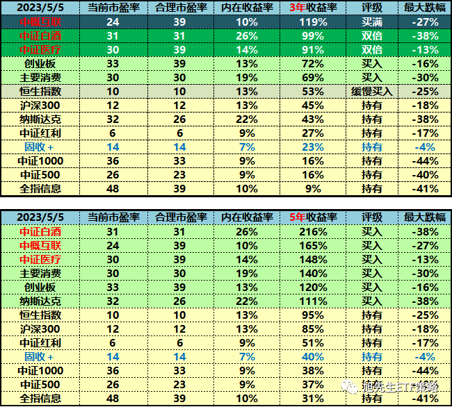 这一期估值表有所变化,一个是随着中概近期回调,估值评级从一个月前的双倍来到了现在的买满级别,由于之前丐丐仓位过满,目前我只能拿出少量余钱加上传媒和保险波段投机卖出来的少量资金缓慢定投丐丐。依然看好丐丐,但需要时间来证明他们的业绩会推着股价上去,这个时间可能是一两个季度,也可能是三五年,whatever,不用急,慢慢来,好东西不涨是好事。第二个较大的变化就是白酒,白酒近期没跌多少,但3年估值收益率却升得很快,评级接近买满,为什么呢?因为一季报白酒业绩持续稳定增长,盈利提升,市值小跌,市值除以盈利也就是市盈率估值也就随之下跌,更多的是盈利推动了估值下跌,将来大概率还会出现越涨越便宜的情况,这就是优秀品种的魅力。由于上述原因,我对白酒这类品种,我给的估值是偏激进的,安全边际留得没有其它品种那么多,相信时间会站在白酒这边。第三个看似没什么变化的医疗,其实内部波涛汹涌,医疗虽然我给的三年预期估值与一个月前没有变化,但估值结构我做了调整,这种调整带有主观性质,也就是艺术的一面,不一定对。上期估值以及之前的估值,大致能预计到医疗将来的盈利大概率会下滑,但我却没想到下滑得这么快幅度这么大,由于预期到盈利下滑,之前医疗合理估值给得比较保守,给的32倍PE。随着近期一季报盈利大幅下滑,我反而将合理估值提上去了,目前给的所有品种的上限估值39倍,有人可能会觉得39倍会不会太高了?这个见仁见智,估值就是毛估估,没有标准答案。之前盈利高高在上的时候,是存在戴维斯双杀的可能,估值应当保守,现在盈利下来了,将来反而有了戴维斯双击的可能,估值我反而给得比较激进,这里面有艺术的成分,不一定对。三年后对答案吧。具体操作上,近期我清仓了传媒波段(因为看不太懂,不意味着看空),刚开始分批卖出保险波段,上一个交易日我也将很小部分的500转换到了白酒。传媒的波段,分批卖也不太方便统计赚了多少,保守点,按平均持有一年半,分批平均卖点赚了15%算,年化9%左右,比存银行好些,知足常乐。保险的波段,进行了第一批卖出,卖出时浮盈10%,按平均持有两年算,年化5%左右,也比存银行强,况且后面分批大概率卖得更高,最终年化有望到8%,知足知足。
