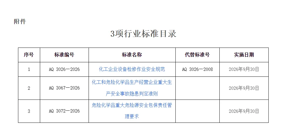 中华人民共和国应急管理部批准《化工企业设备检修作业安全规范》等3项行业标准(标准文本附后),现予公布。
