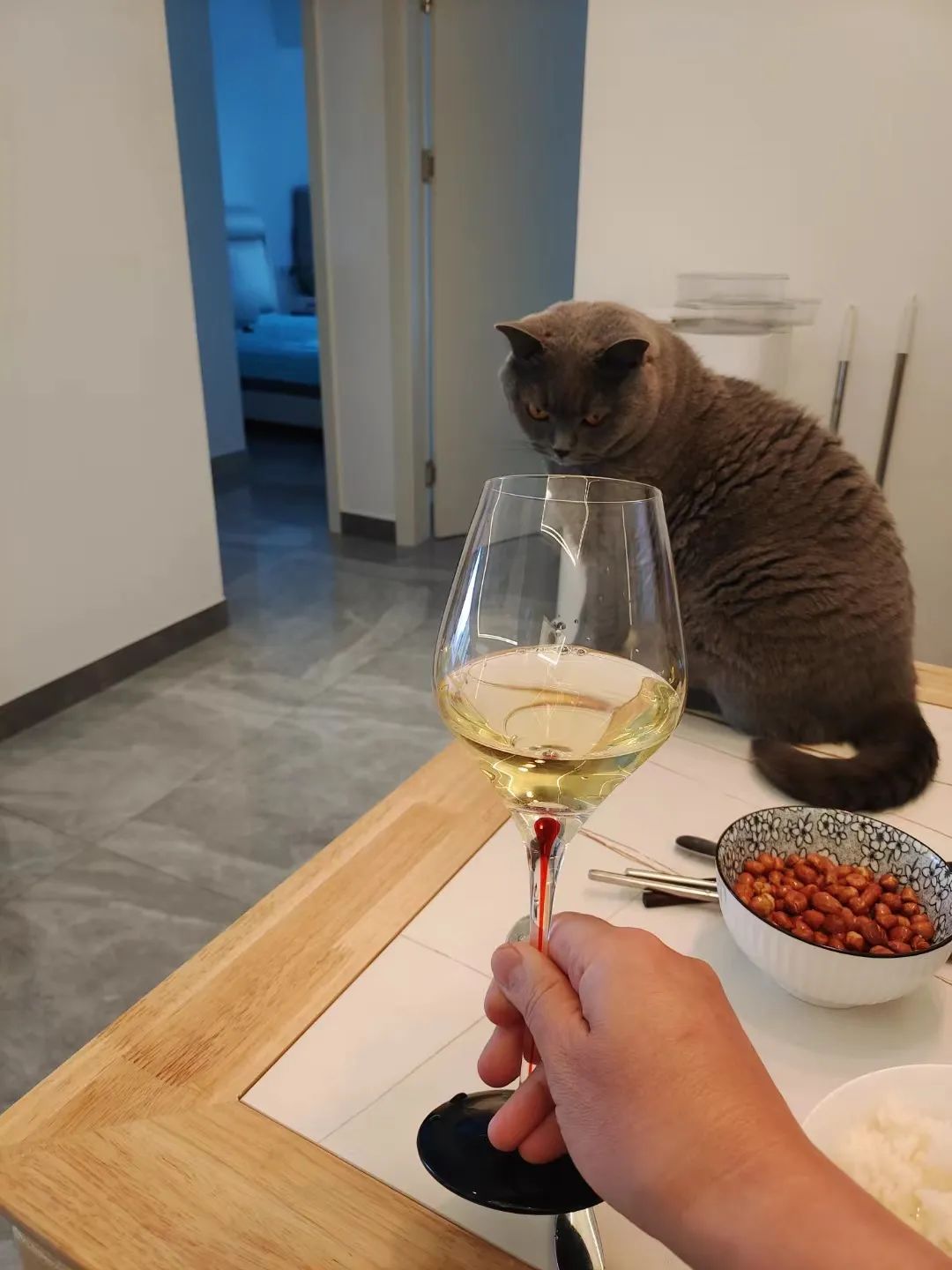 小猫想:考完试了,喝杯白葡萄酒,主人就给配了个花生米下酒...