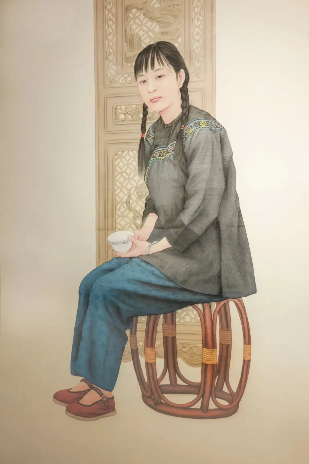 李乃蔚的《屏》以极致写实的工笔语言,将普通人奋进的精神和沉着、淡定的生活、劳动态度优雅地定格在画中,也在虚实交错中,照见时代的精神底色。