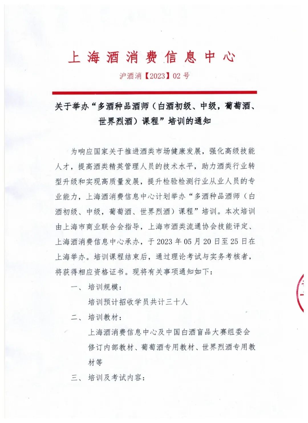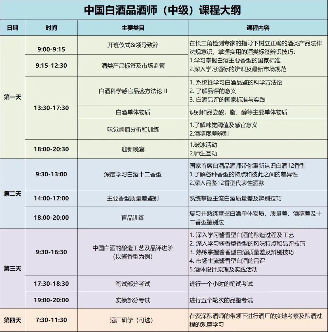 2023年5月20-22日,中国白酒品酒师中级课程四期将再度起航。白酒品评技能作为酒业人需要具备的基本职业技能,也是精进专业技术水平不可缺少的一项技能,白酒品酒师作为中国白酒产业高质量发展的一环,提供了重要支撑力。在前三期课程成功举办的基础上,第四期名师带队旨在打造更为适合中国白酒爱好者和行业从业人员的专属白酒课程!中国白酒品酒师系列课程由上海酒消费信息中心、上海酒类产品质量监督检验站联合国内资深白酒行业专家共同研发。课程由初级课程(入门)、中级课程(进阶)、高级研学课程和专题课程组成,课程从传统且有趣的白酒文化出发,围绕白酒感官品评的技能核心,创造性引入世界主流烈酒的发展现状和工艺差异,结合最新国家标准和市场监管规则,打造更为适合中国白酒爱好者和从业人员的专属白酒课程!为中国白酒市场化教育添砖加瓦!第四期白酒中级班做了更多的优化和升级,使得教学工作更多科学化、合理化。由国内著名白酒专家主讲的《白酒科学感官品鉴方法论》将为中级班的学员建立和培养专业和使用的白酒品评核心技能,国内著名酱酒专家将教授全面的酱酒知识和酿造工艺,并为大家准备了独家的轮次酒款及质量差对比品评。课程还将深入上海酒厂等地研学,将理论知识和实践更好的结合!第四期中国白酒品酒师(中级)课程将使用国家标准白酒品酒师教材及酒类产品标签专业教材,结合讲师精心编纂的讲义,贴近市场实际需求。课程酒水将使用标准十二香型品鉴用酒套装、白酒质量差品鉴用酒套装(非卖品)、酱香型白酒七个轮次品鉴酒样(独家非卖)并由老师精选市场上的经典产品进项教学对比品鉴,为学员建立正确的白酒科学品鉴观念。中级课程教学品鉴酒款达近50款。同时,中级班学员将额外获赠一套标准十二香型闻香套装和罗派白酒闻香手工水晶杯。数位中国酿酒大师、中国首席白酒品酒师以及国家级白酒评委,共同组成全行业顶尖讲师团队。通过理论与实操相结合的授课模式,围绕白酒专业品鉴的技能核心,结合最新国家标准与市场监管规则,为行业同仁提供标准化、多样化、专业化的培训课程。为了让中级班的学员能有更直观的课程体验和场景化的教学收获,将繁杂的理论知识和实际更好的结合在一起。本期课程还特别为大家准备了专场研学,学员将在酿酒师及行业专家的带领下,全方位学习和了解有关白酒的生产、加工、包装、流通、质量检验、市场规范等知识内容。上海酒消费信息中心:成立于2013年,由上海市商务委员会直属单位上海市酒类产品质量监督检验站发起成立的民办非企业组织,与上海酒类主管部门、上海生产及流通领域相关行业协会、酒商及酒厂等具有长期深入的合作关系,致力于联合各方搭建酒类综合公益服务平台,开展酒文化宣传、酒类信息发布、市场推广等公益活动。