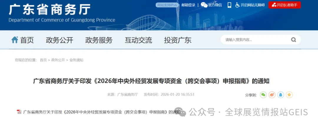 广东省商务厅关于印发《2026年中央外经贸发展专项资金(跨交会事项)申报指南》的通知
