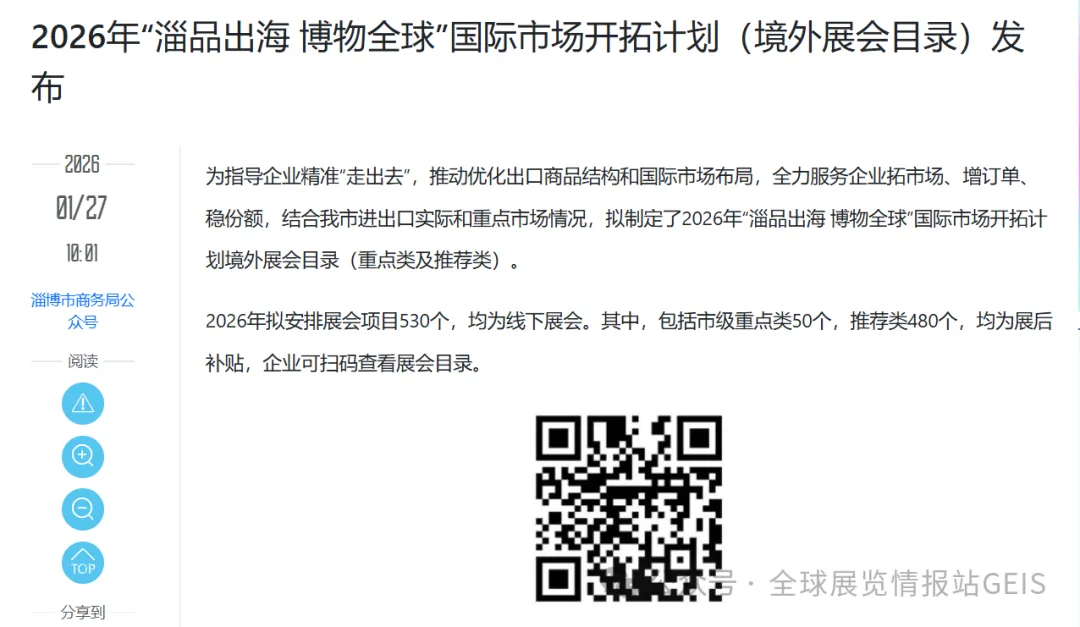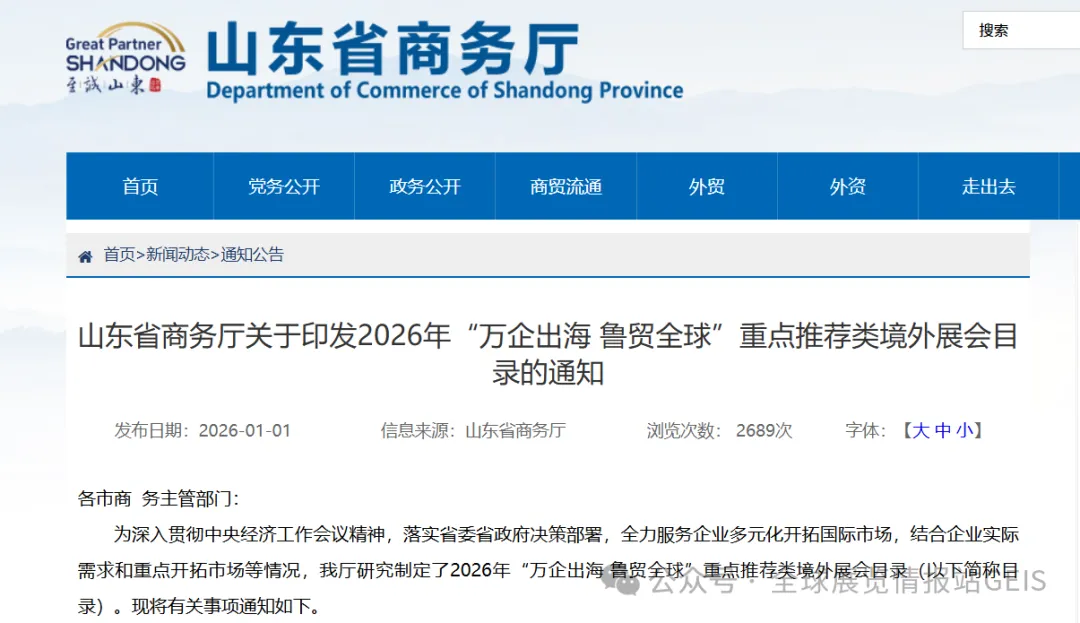 展会目录:省商务厅发布《2026年 "万企出海鲁贸全球" 重点推荐类境外展会目录》,共 523 个展会项目(新兴市场 353 个,传统市场 170 个)