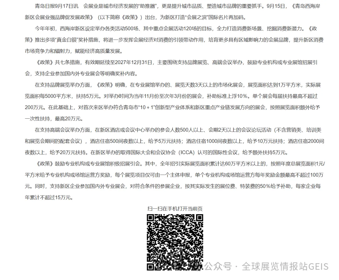 《青岛西海岸新区会展业强品牌促发展政策》