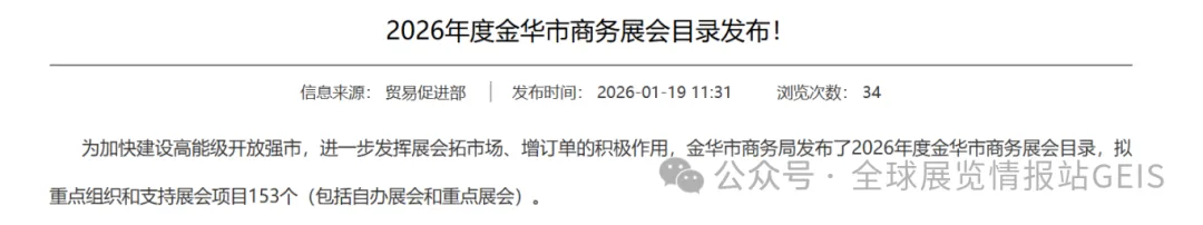 2026年拟重点组织和支持展会项目共153个,其中“金贸全球 金华优品海外行”系列自办展会12个,支持重点展会141个。