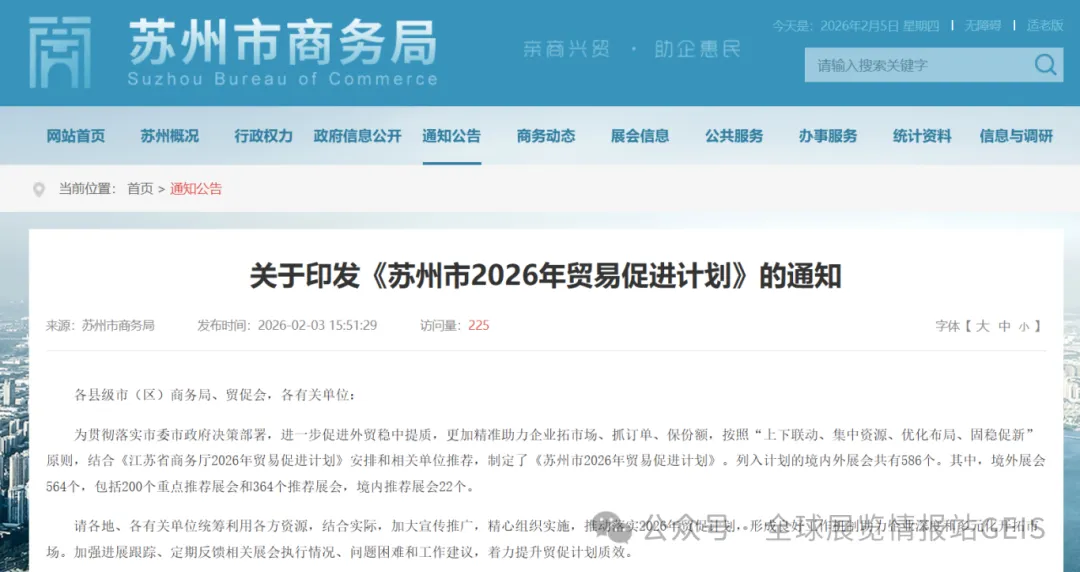 结合《江苏省商务厅2026年贸易促进计划》安排和相关单位推荐,制定了《苏州市2026年贸易促进计划》。列入计划的境内外展会共有586个。其中,境外展会564个,包括200个重点推荐展会和364个推荐展会,境内推荐展会22个。