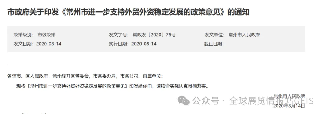 《常州市进一步支持外贸外资稳定发展的政策意见》(境外参展补贴核心依据)