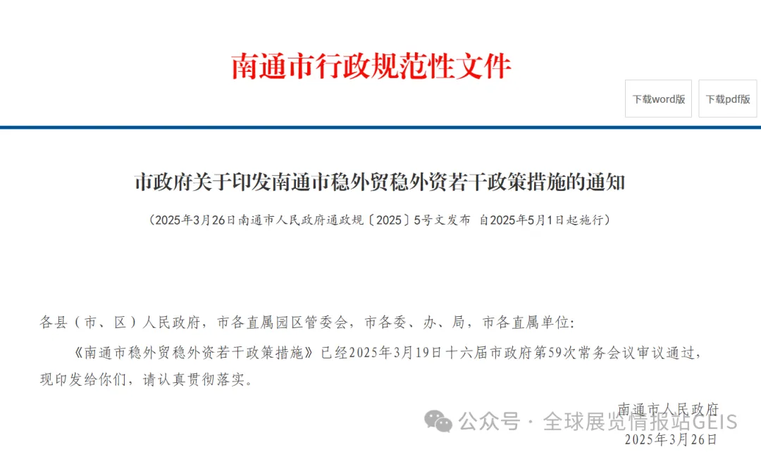 《市政府关于印发南通市稳外贸稳外资若干政策措施的通知》,2025年发布,2026 年继续执行。