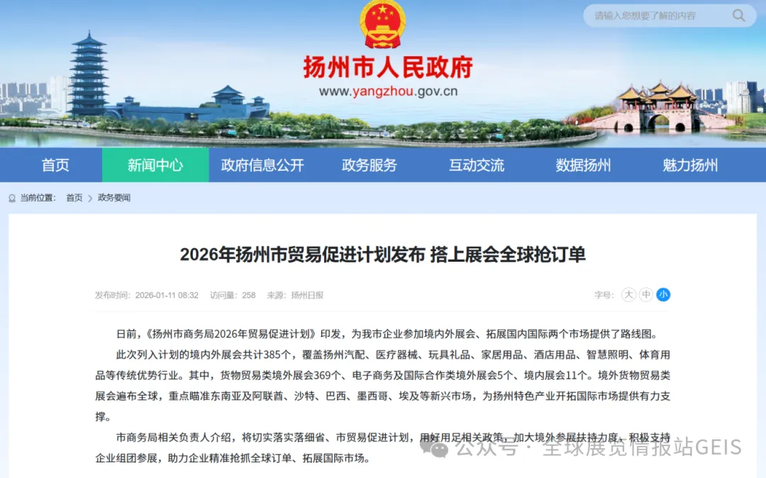 《扬州市商务局2026年贸易促进计划》印发,此次列入计划的境内外展会共计385个,覆盖扬州汽配、医疗器械、玩具礼品、家居用品、酒店用品、智慧照明、体育用品等传统优势行业。其中,货物贸易类境外展会369个、电子商务及国际合作类境外展会5个、境内展会11个。境外货物贸易类展会遍布全球,重点瞄准东南亚及阿联酋、沙特、巴西、墨西哥、埃及等新兴市场,为扬州特色产业开拓国际市场提供有力支撑。