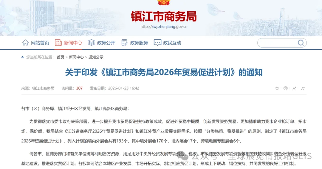 结合《江苏省商务厅2026年贸易促进计划》和镇江外贸产业发展实际需求,按照“分类施策、稳妥推进”的原则,制定了《镇江市商务局2026年贸易促进计划》,列入计划的境内外展会共有193个,其中境外展会170个,境内展会17个,跨境电商专题展会6个。