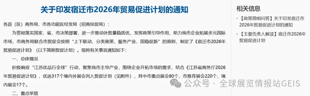积极响应“江苏优品行全球”行动,聚焦我市主导产业,围绕企业开拓市场的需求,结合《江苏省商务厅2026年贸易促进计划》,优选317个境内外展会列入贸促计划,其中市重点展会80个,市推荐展会220个,境内展会17个。