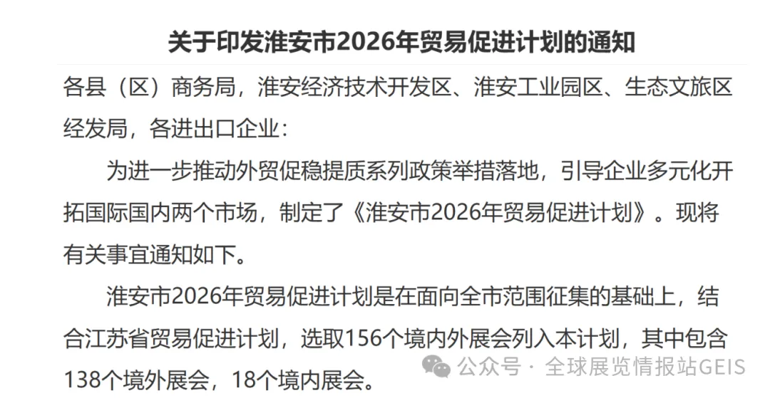 淮安市2026年贸易促进计划是在面向全市范围征集的基础上,结合江苏省贸易促进计划,选取156个境内外展会列入本计划,其中包含138个境外展会,18个境内展会。