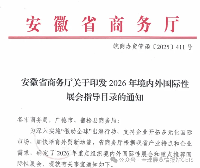 《安徽省商务厅关于印发2026年境内外国际性展会指导目录的通知》