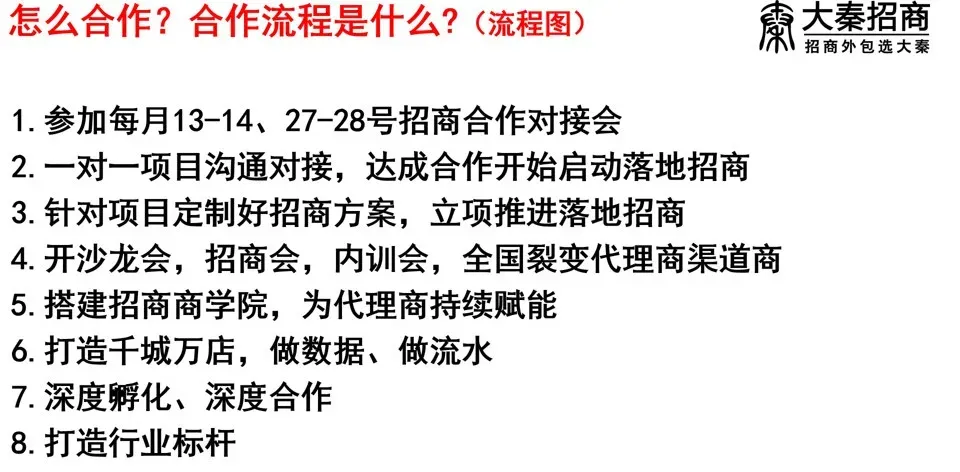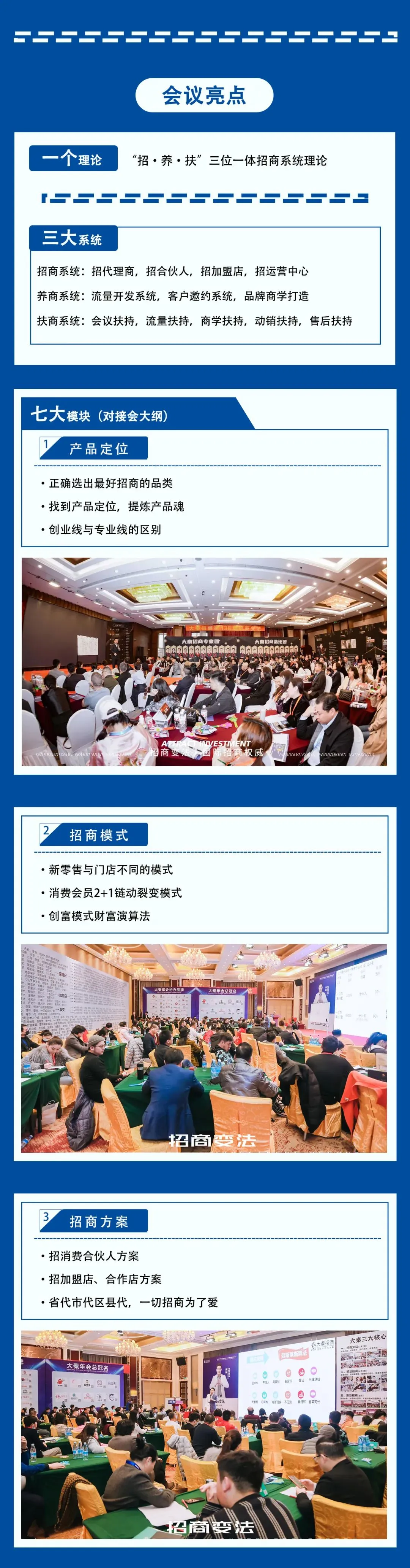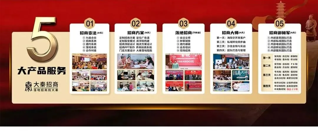 为了帮助企业更好地应对挑战,抓住发展机遇,大秦招商全方位筹备了线下招商对接会——《招商变法》,通过产品定位、招商模式、招商方案、会销系统、邀约系统、商学院系统、扶商系统这七大系统,来帮助企业实现招商增长。