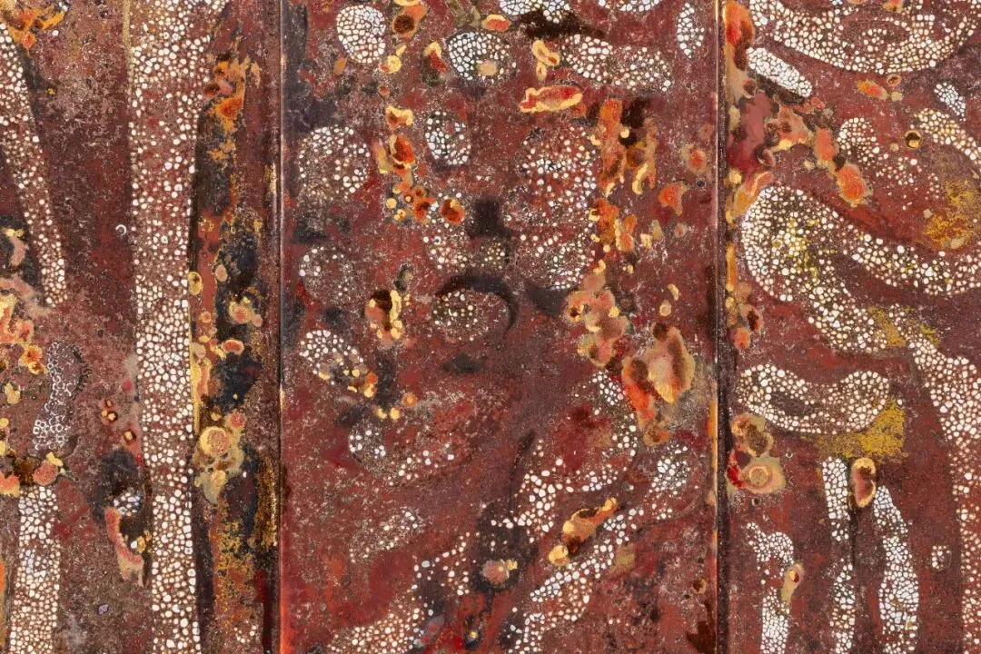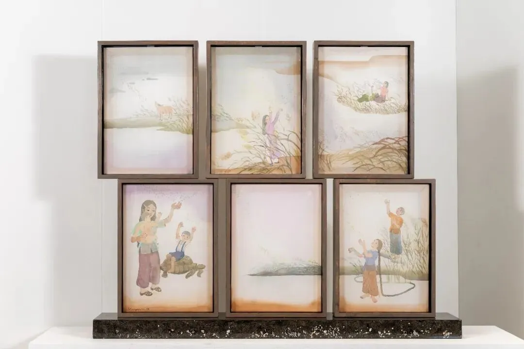 潘涛阮,《沉积考古学(飘摇野草)》,2025,绢本水彩及水粉,越南漆、颜料、蛋壳、银箔于木板上,150 x 190 x 30 cm,每幅画作:73 x 53 cm;带漆底座:10 x 190 x 30 cm
