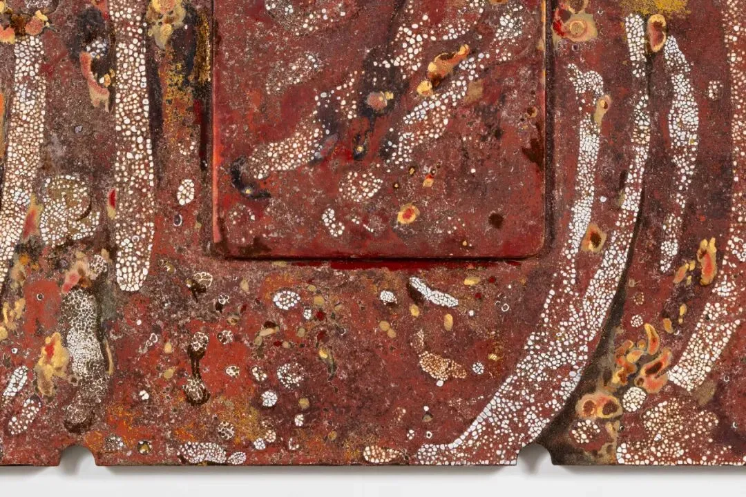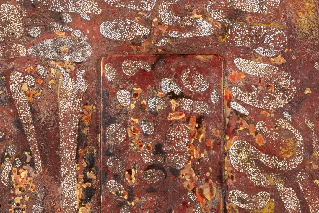 张公松,《In search of the present... (P + …)》,2025 - 至今,木板上越南漆、蛋壳、银箔、金箔、泥土、时间、温度……,140 x 117 cm
