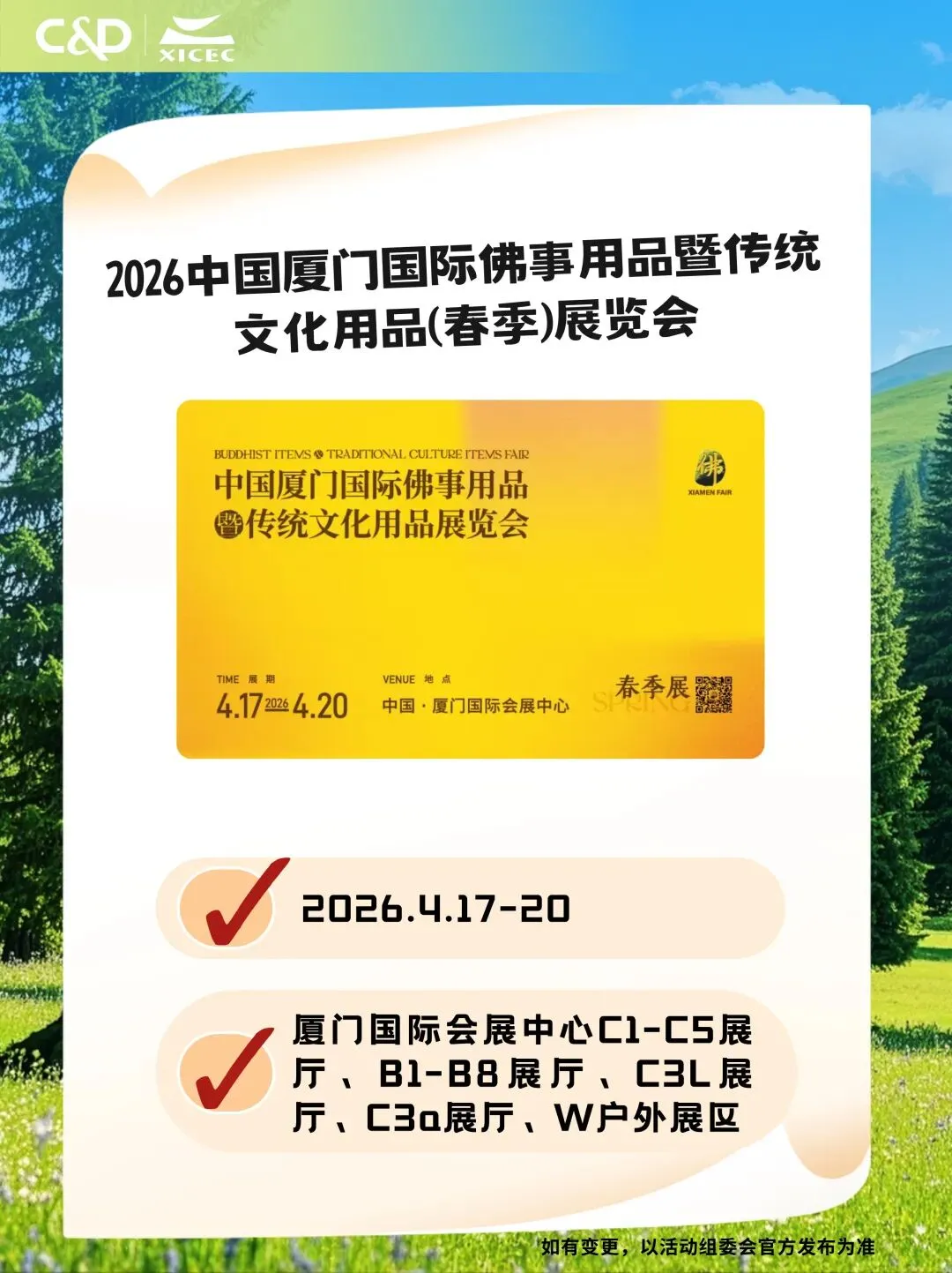 ?2026中国厦门国际佛事用品暨传统文化用品(春季)展览会⏰ 时间:2026.4.17-20? 地点:厦门国际会展中心C1-C5展厅、B1-B8展厅、C3L展厅、C3a展厅、W 户外展区