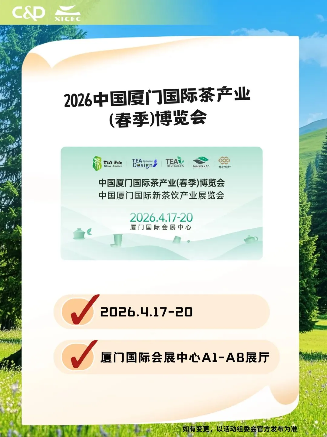 ? 2026中国厦门国际茶产业(春季)博览会⏰ 时间:2026.4.17-20? 地点:厦门国际会展中心A1-A8展厅