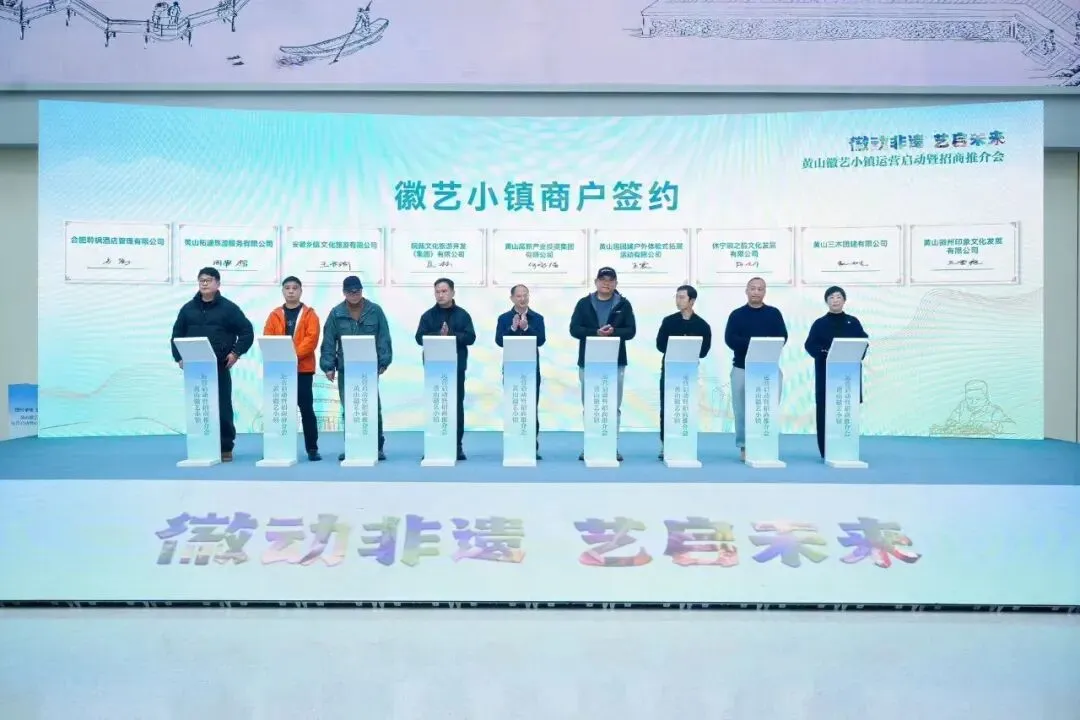 现场,徽艺小镇展示了丰硕的招商成果。上海携程商务有限公司、江苏品正光电有限公司、黄山市博斯文化创意发展有限公司等12家优质商户完成入驻意向签约;安徽省研学工委银发研学皖南分会、长三角自驾游协会联盟、各旅行社等22余家机构达成合作签约,为小镇业态丰富与市场运营筑牢根基。