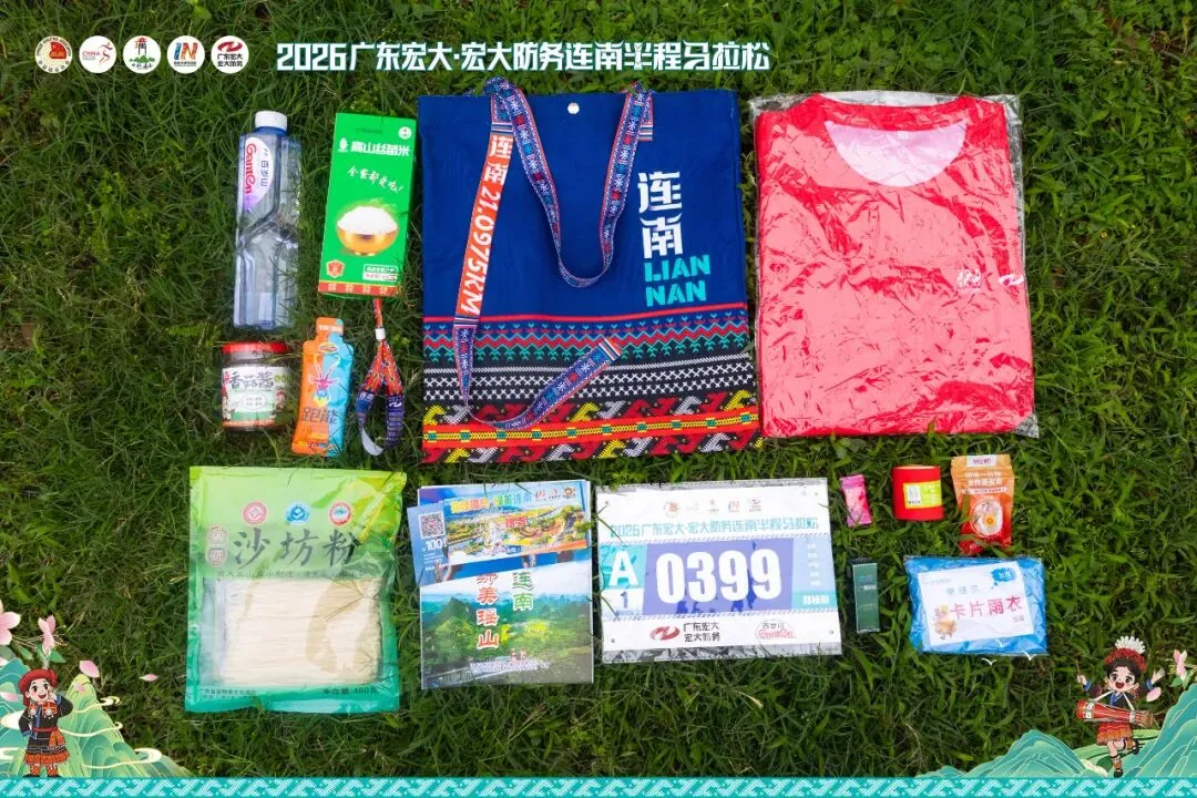 除拓印瑶族纹饰的战衣、轻巧便捷的参赛包、参赛号码布、防替跑手环、雨衣、能量胶、矿泉水、盐丸几项赛事主办方发放的物资外,还有瑶山香菇酱、连南大叶茶、高山丝苗米、连南沙坊粉、游乐场优惠券、马孔多现金券等共计14项。(注:赞助商物资,自愿领取)