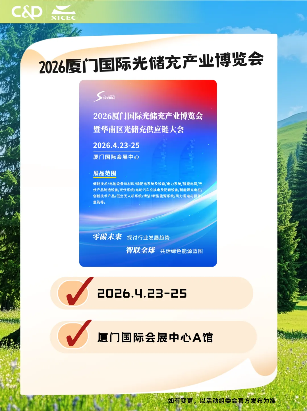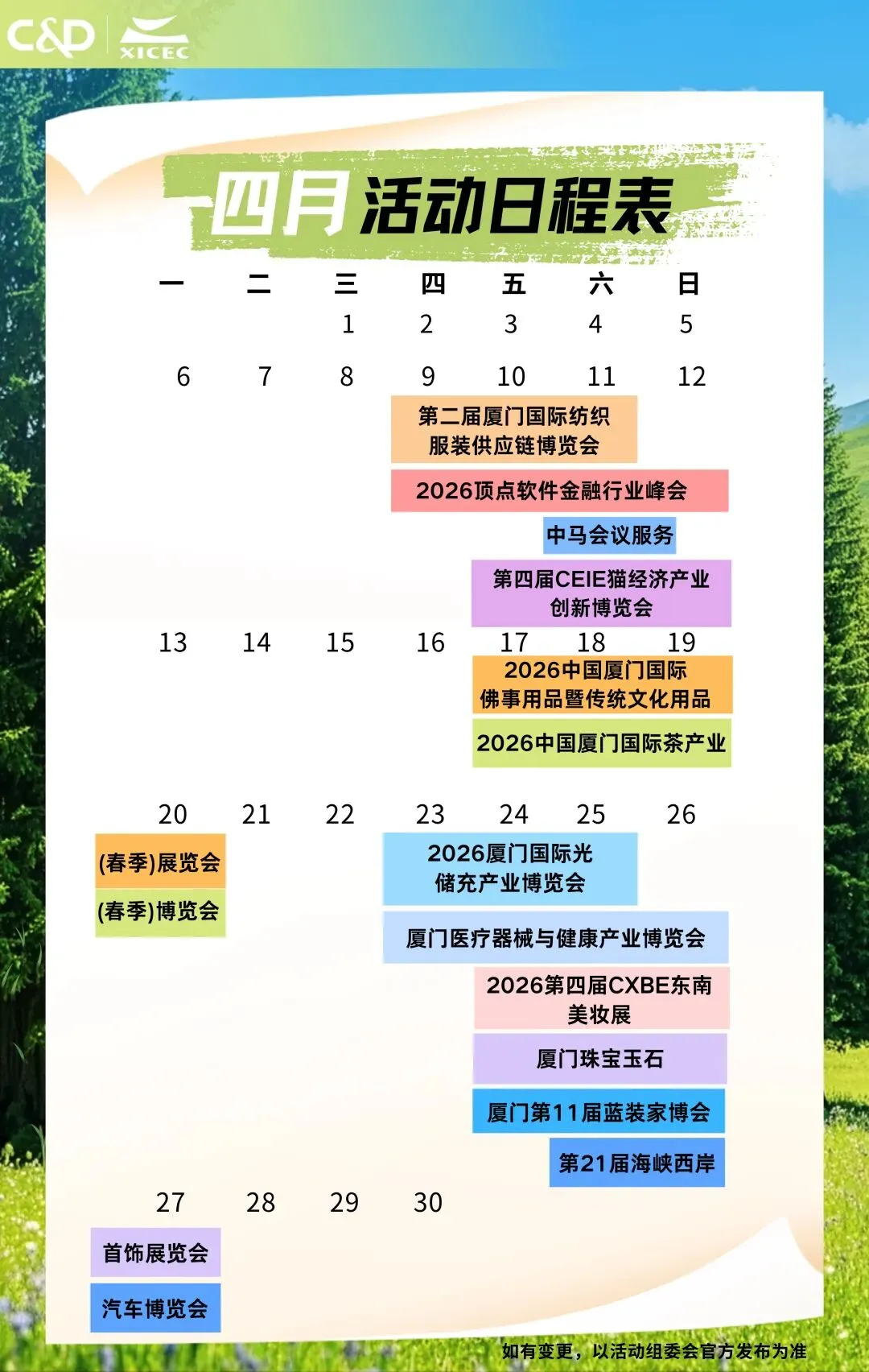 ? 中马会议服务⏰ 时间:2026.4.11? 地点:厦门国际会议中心?2026中国厦门国际佛事用品暨传统文化用品(春季)展览会⏰ 时间:2026.4.17-20? 地点:厦门国际会展中心C1-C5展厅、B1-B8展厅、C3L展厅、C3a展厅、W 户外展区? 2026中国厦门国际茶产业(春季)博览会⏰ 时间:2026.4.17-20? 地点:厦门国际会展中心A1-A8展厅☀️ 2026厦门国际光储充产业博览会⏰ 时间:2026.4.23-25? 地点:厦门国际会展中心A馆