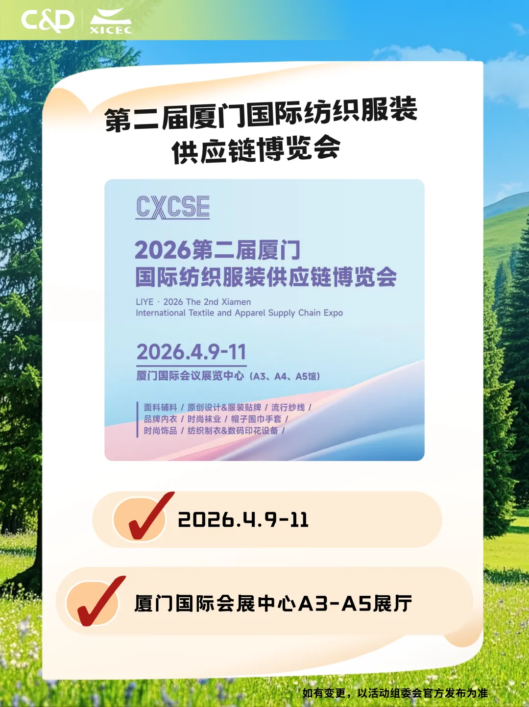 ? 第二届厦门国际纺织服装供应链博览会⏰ 时间:2026.4.9-11? 地点:厦门国际会展中心A3-A5展厅