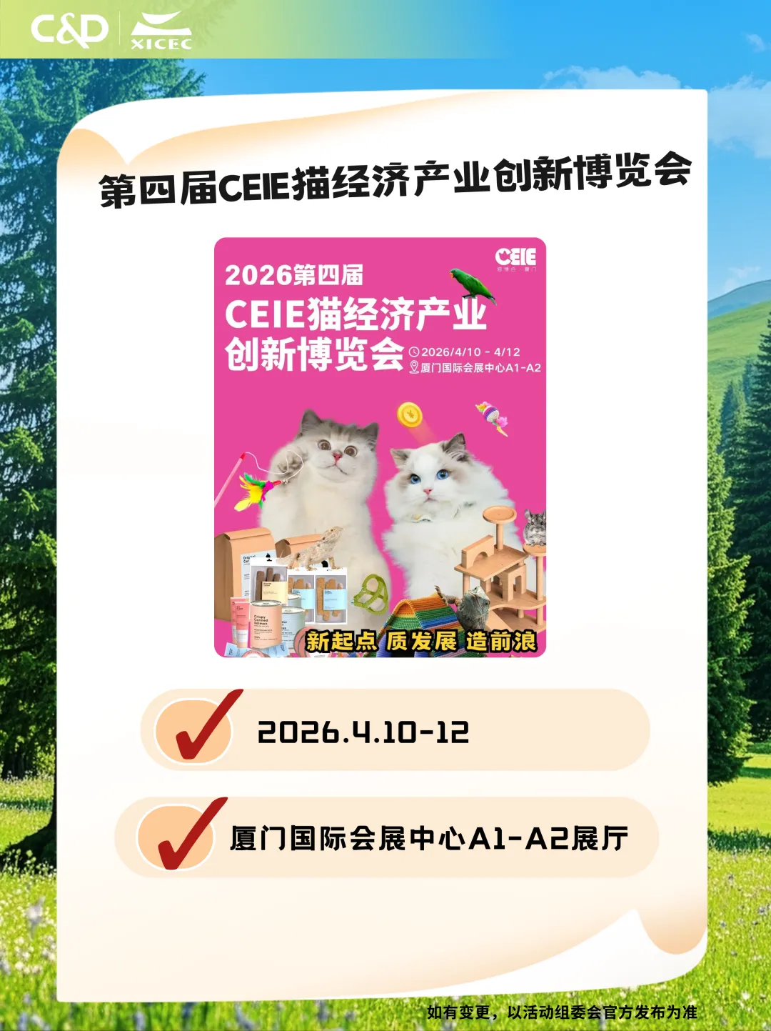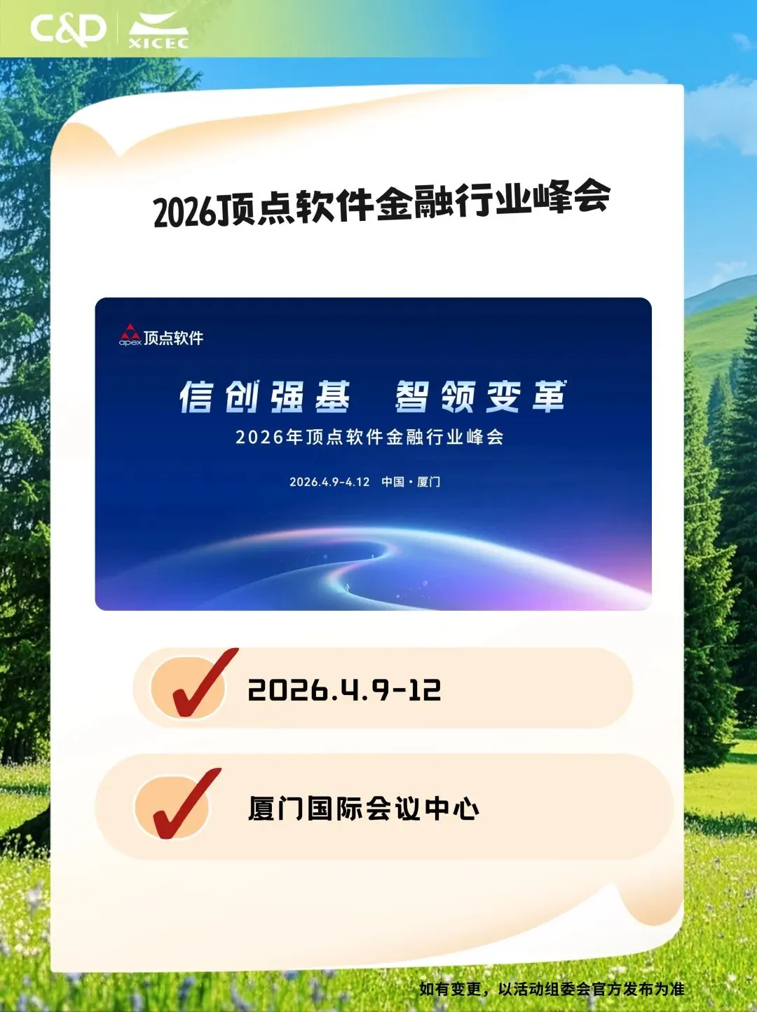 ? 2026顶点软件金融行业峰会⏰ 时间:2026.4.9-12? 地点:厦门国际会议中心? 第四届CEIE猫经济产业创新博览会⏰ 时间:2026.4.10-12? 地点:厦门国际会展中心A1-A2展厅