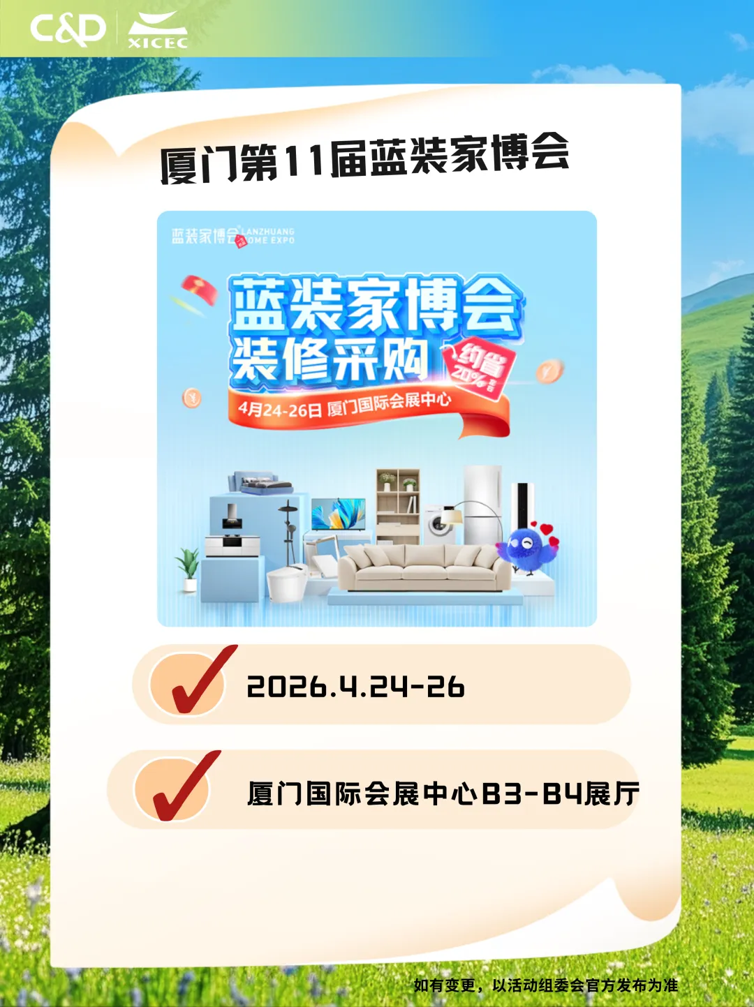 ?️ 厦门第11届蓝装家博会⏰ 时间:2026.4.24-26? 地点:厦门国际会展中心B3-B4展厅