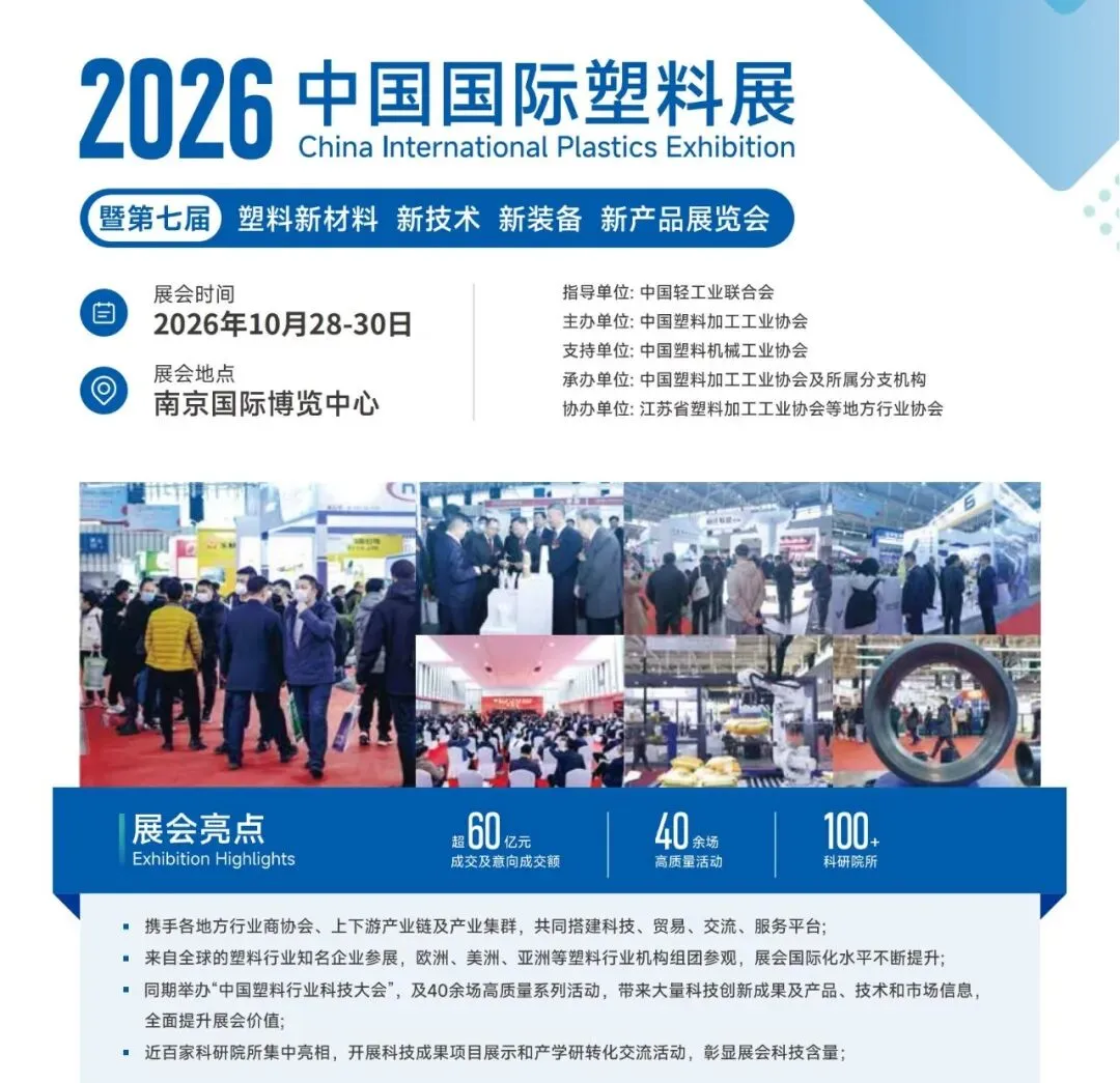 2026年10月28日-30日在南京国际博览中心举办“2026中国国际塑料展览会暨第七届塑料新材料、新技术、新装备、新产品展览会”。